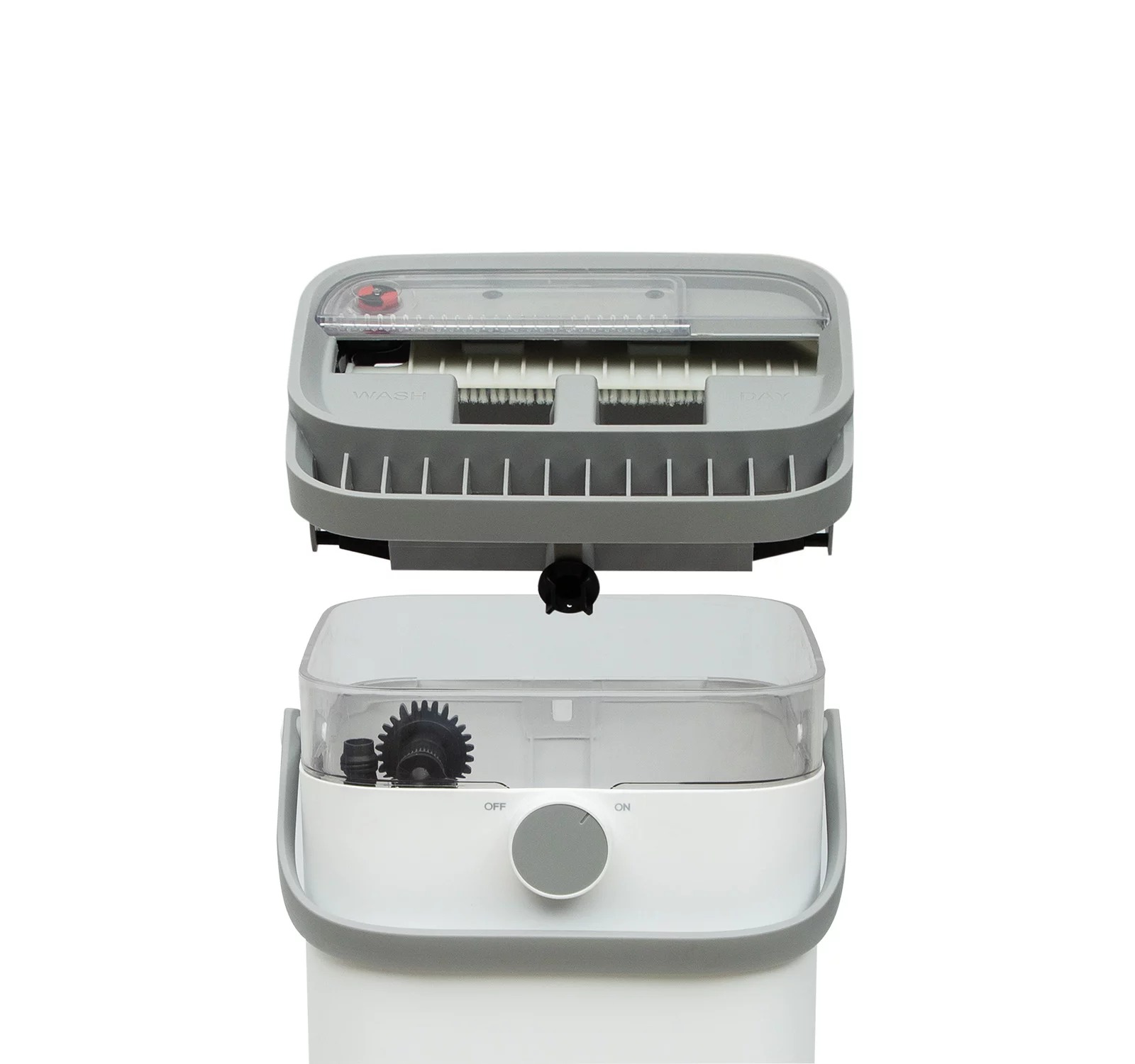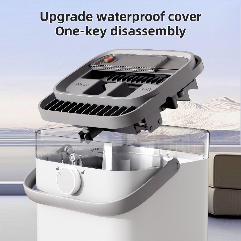 با قرار دادن کفه تی درون قسمت Dry به صورت خودکار عمل خشک کردن و آبگیری صورت می گیرد و آب کثیف ناشی از شستشو به قسمت بیرونی محفظه شفاف حاوی آب تمیز می رود تا این دو با هم ترکیب نشوند.